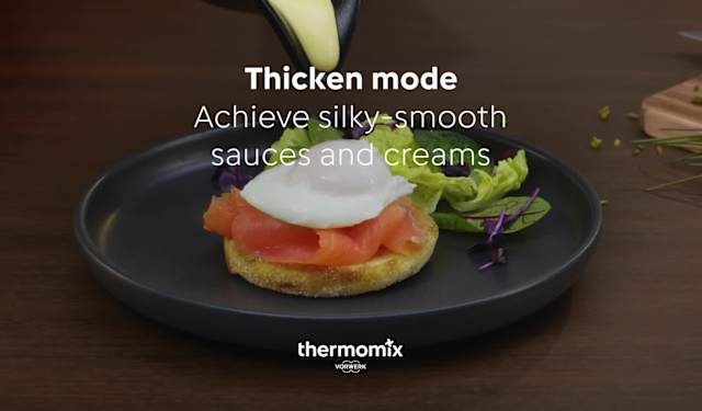 Thicken mode produces silky textures and the perfect consistency for all sorts of sauces and creams. In this mode you can thicken sauces such as vanilla pudding, béchamel, and other sauces with eggs, egg yolk, flour, and cornflour. Milk, cream, or baby food may be warmed without burning.
