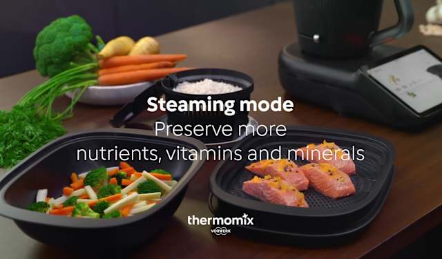 Steaming mode allows you to cook generous portions with ease. With the larger Varoma®, Thermomix® makes it simple to steam whole sides of salmon, vibrant vegetables and more all at once, and all to perfection.