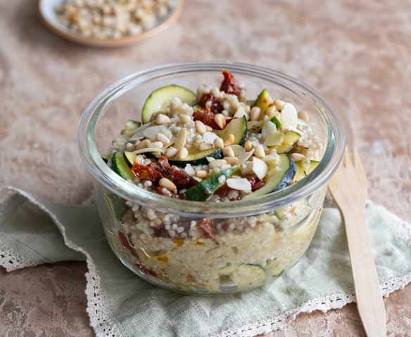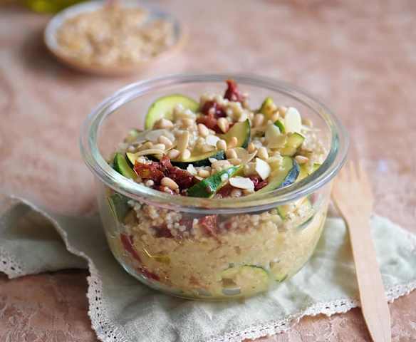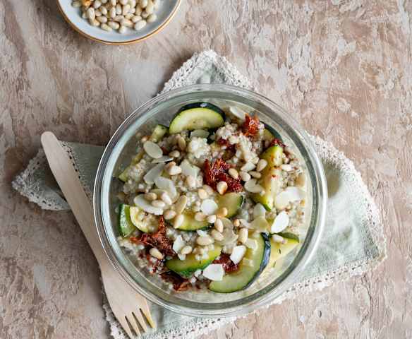 Cytrynowy pęczak z fasolką szparagową, szpinakiem i suszonymi pomidorami