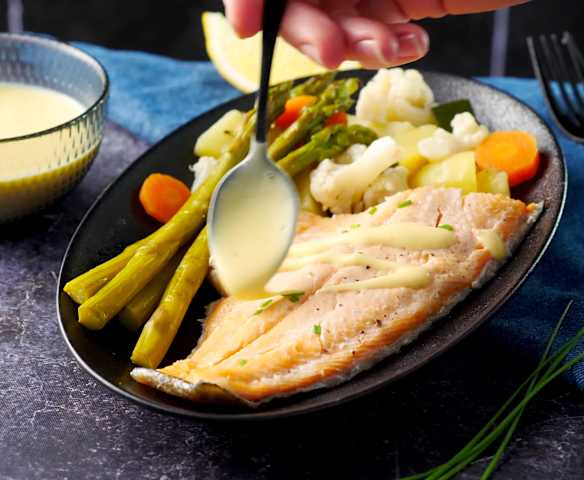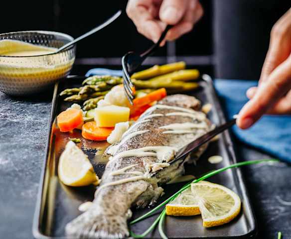 Sandacz w papilotach na parze z warzywami i sosem berneńskim