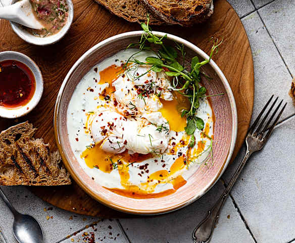 Turecká vejce (Cilbir) na řeckém jogurtu, servírovaná s opečeným chlebem a zeleninovým salátem