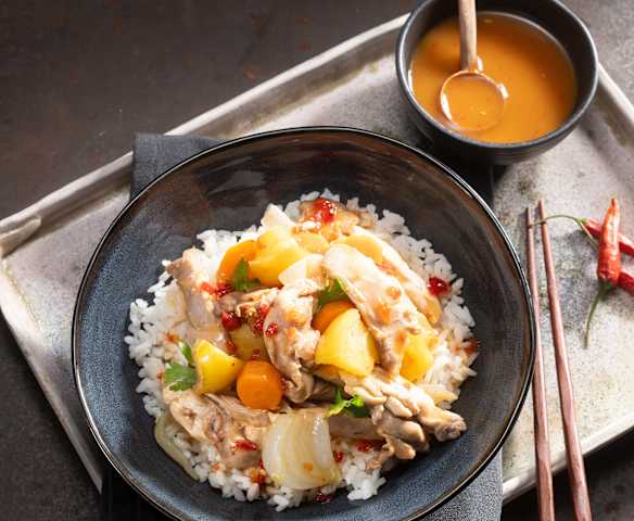 500 g Hähnchenbrustfilet, ohne Haut, in Streifen (1,5 cm x 3-4 cm), trocken getupftHähnchen-Oberschenkel, ohne Knochen und Haut in Streifen (1,5 cm x 3-4 cm), trocken getupft500 g