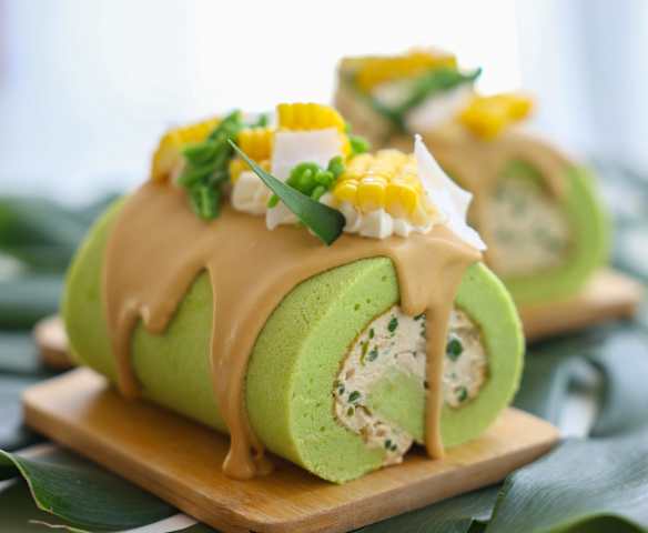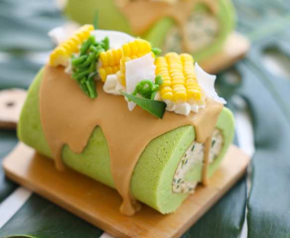 โรลเค้กใบเตย สอดไส้ครีม น้ำตาลมะพร้าว-ลอดช่องไทย