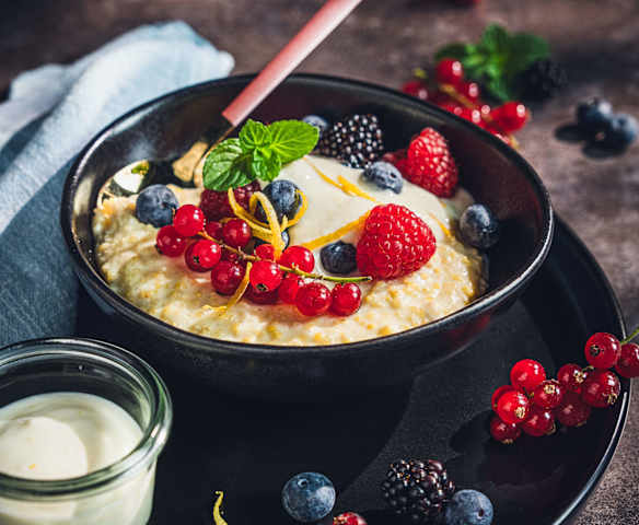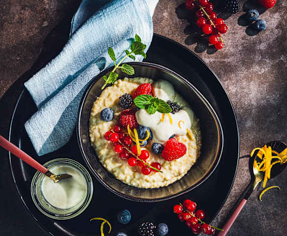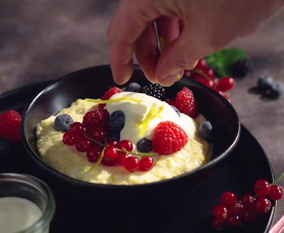 Warmer Hirsepudding mit Beeren und Ricotta-Topping